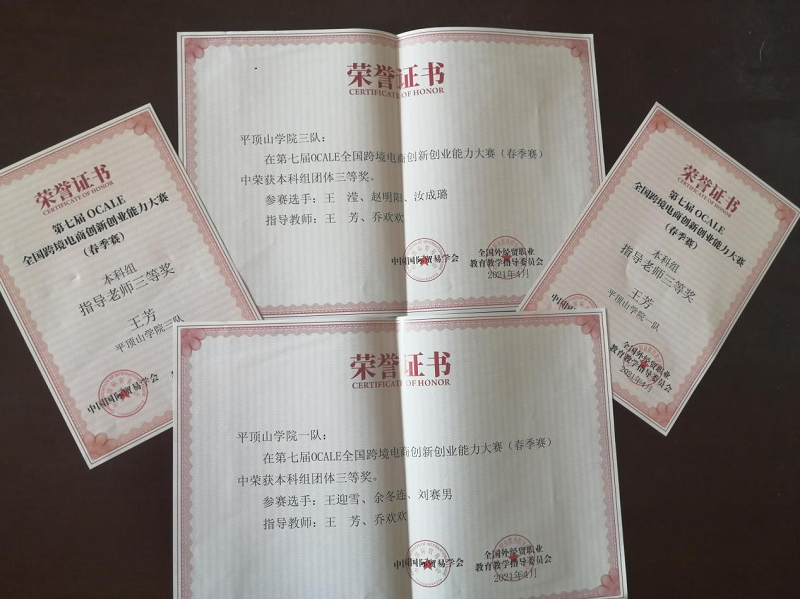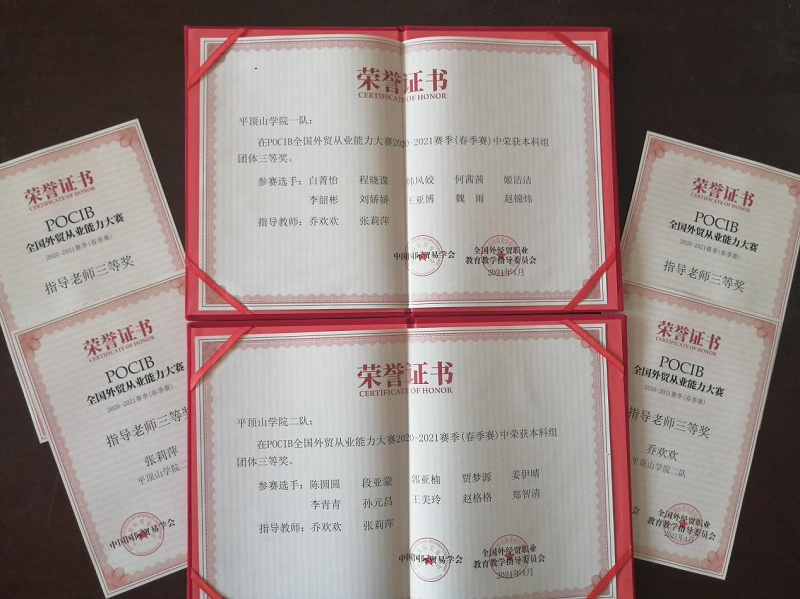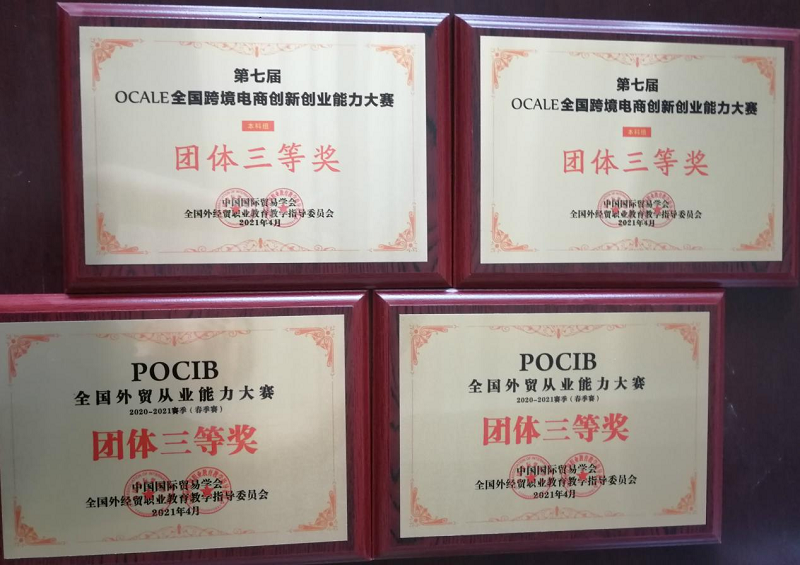 近日,beat365中文官网国际经济与贸易专业员工分别参加了由中国国际贸易学会和全国外经贸职业公司产品指导委员会主办,中国国际贸易学会培训处和南京世格软件有限责任公司承办的第十届POCIB全国外贸从业能力大赛(春季赛)和第六届OCALE全国院校跨境电商运营决策能力大赛,获得多项奖项。
