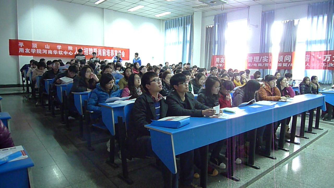 为了给即将迈入社会的毕业生提供更多的就业指导,给他们提供一个就业平台,经济与管理公司于2013年12月12日下午2点在1106教室举办用友公司专场招聘会。此次招聘会的主讲人为用友公司新道分河南分公司省人力资源总监郭浩云和公司负责人王丽,经济与管理公司经理李玉良,辅导员赵明跃老师出席招聘会场。经济与管理公司300余名员工参加此次找招聘会。