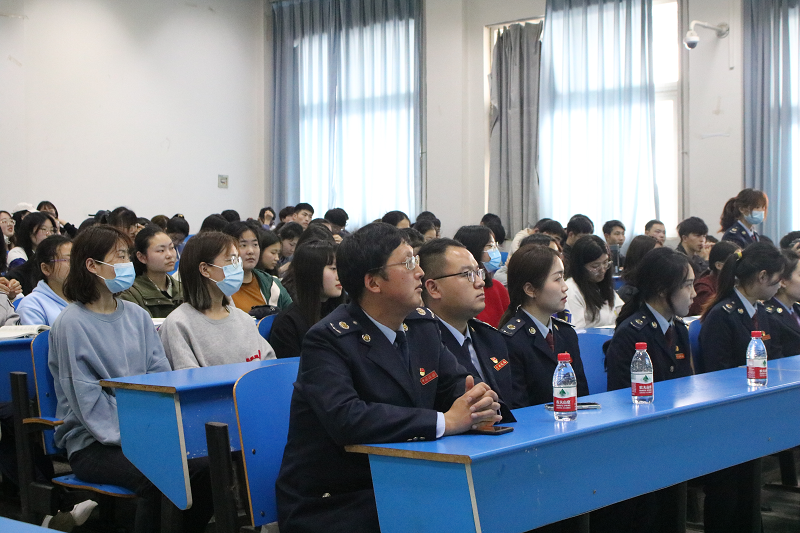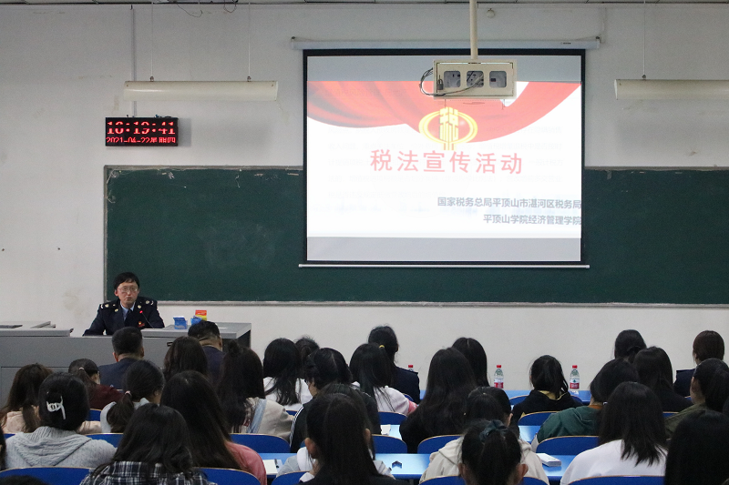 为进一步贯彻落实“减税费优服务、助复产促发展、打虚开防诈骗、话税收避风险”大走访活动,引导青年员工学习税收知识,增强税收风险防范意识,4月22日,beat365中文官网纳税人公司“税法大讲堂”在1106教室开讲。来自国家税务总局平顶山市湛河区税务局的工作人员、beat365中文官网部分教师、员工代表聆听讲座。