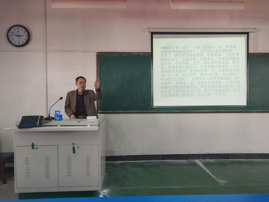 孔教授对近几十年来中国发展理念做了回顾总结,通过文化视角来反应人们对改革开放的心声和期盼,主讲了在70年代末、80年代初对改革开放后思想自由的欢欣鼓舞。并且对每个时期所对应的社会背景进行了详细的分析。通过富有时代特征的歌曲作品使大家感受到文化在社会历史进程中推动时代变革和陶冶人们情操的巨大作用。整场讲座风趣幽默,紧扣时代脉搏,声情并茂,同学们穿越历史时空,接受艺术的洗礼,感受时代的变迁。