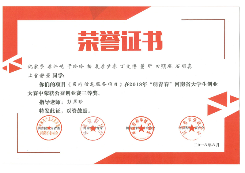 公司参赛选手在比赛中以新颖的角度、独特的创业观点充分展现自己的作品,并在公开答辩中获评委老师的一致认可。最终,以2016级市场营销专业贾卫亮为队长、由李文同老师指导的《一窑陶艺网络平台有限责任公司》项目,以2015级国际经济与贸易专业邢雪可为队长、由王翠英、杨玉敬老师指导的《优讯平台》项目,以2016级会计学(中外合作)专业仇家荣为队长、彭翠珍老师指导的《医疗信息服务项目》等三个创业项目在2018年“创青春”河南省老员工创业大赛上获得三等奖。