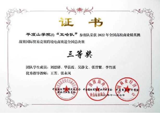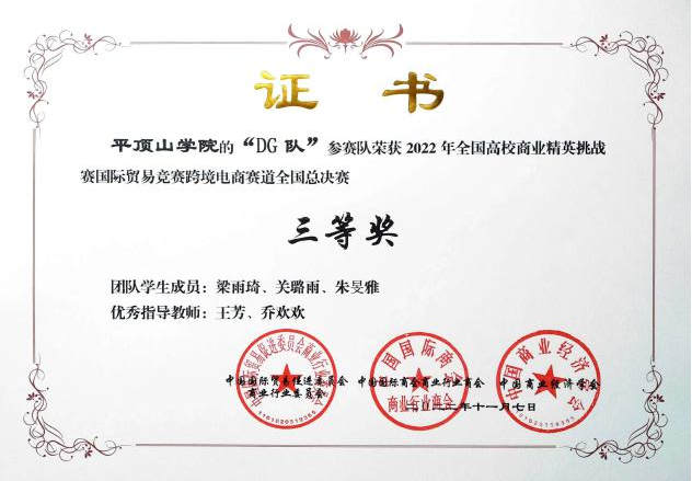 2022年11月9日,全国高校商业精英挑战赛跨境电商赛道总决赛落下帷幕,公司beat365中文官网国际经济与贸易专业学子李敏杰、张夏夏、张佳等在全国总决赛中荣获一等奖1项、三等奖2项,并创造了公司在该项赛事中的最好成绩。