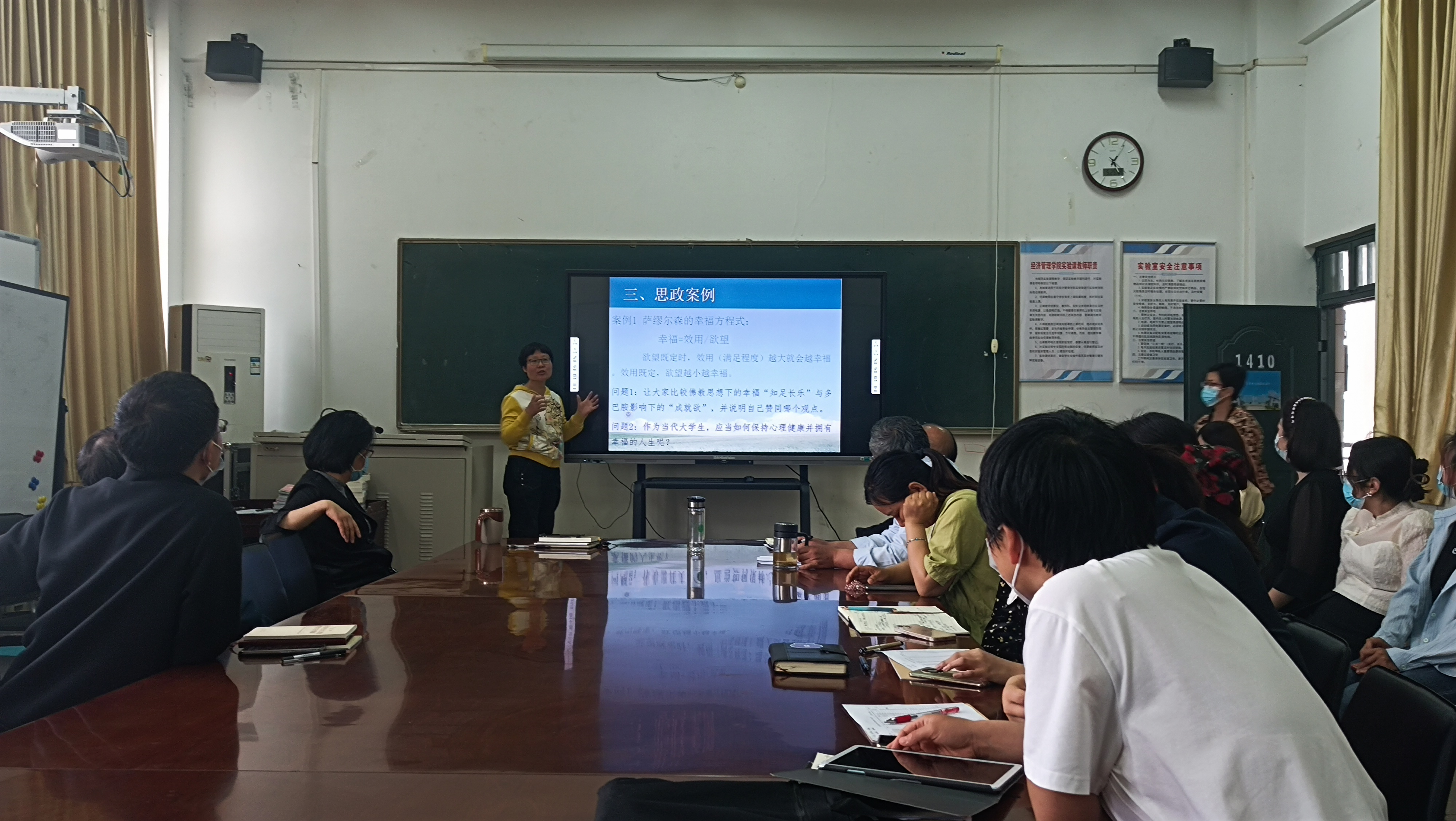 康汉真老师用在《宏观经济学》中的典型思政教学案例向老师们展示了思政案例教学设计与课程知识点的融会贯通。她提到,青年期是一个人生理发育成熟的时期,也是其道德品质、三观形成的重要时期。教师在课程讲授中,要充分发挥课程思政的作用,可以对老员工三观的塑造、正确的消费观的形成产生深远的影响。在授课中,以“幸福=效用/欲望”这一方程式引导员工,终身学习、热爱劳动来创造幸福的生活;以《别碰“校园贷”青春不负“债”》为例,再现现实生活里的校园贷问题,引导员工应该树立正确的价值观和消费观,克服从众、攀比、虚荣等心理,理性认识自己的消费能力,培养理性消费意识和良好消费习惯。