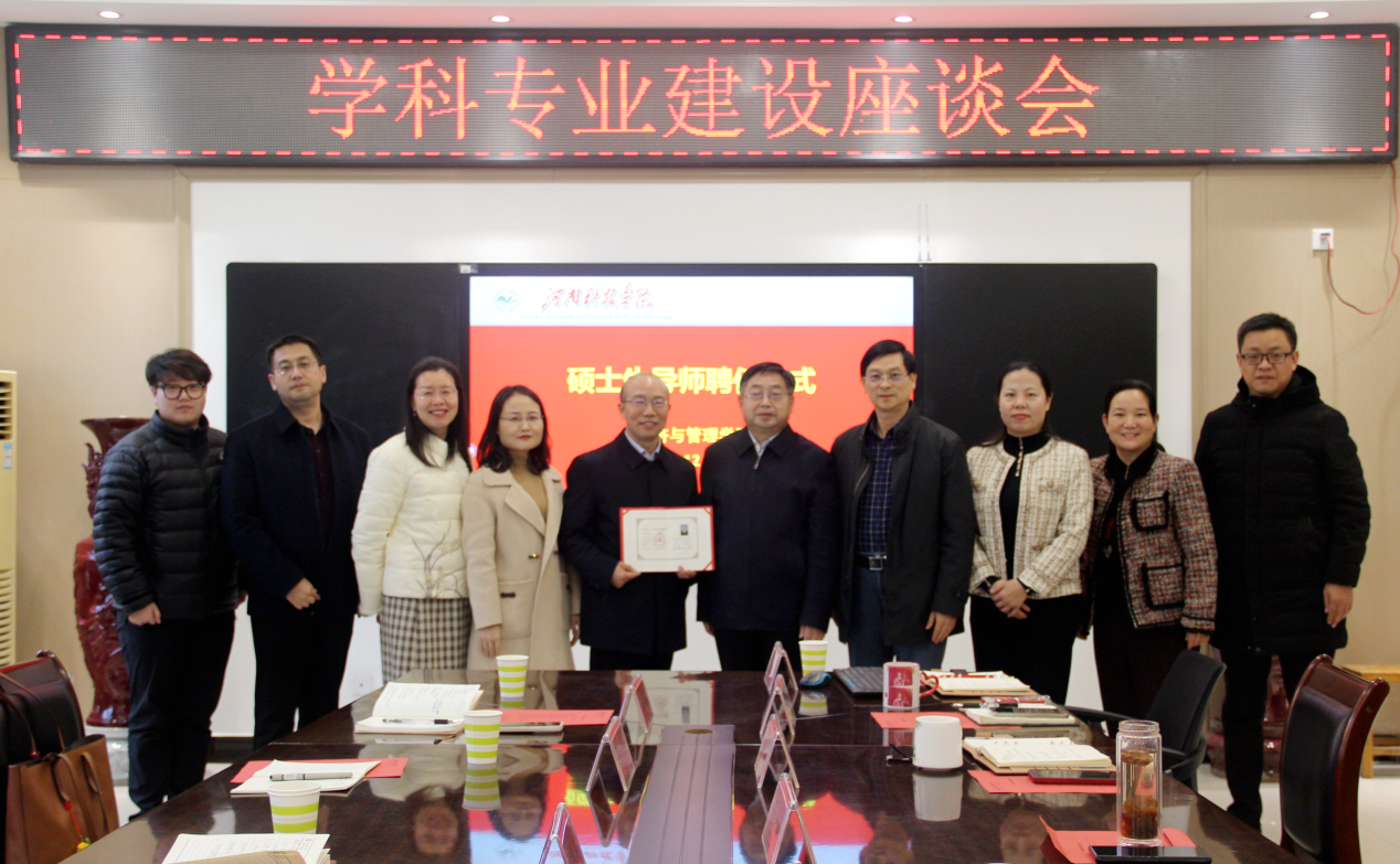 罗士喜代表河南科技公司经济与管理公司对张振江一行来访表示欢迎,并简要介绍了公司发展历程,以及在团队建设、人才培养、科学研究、社会服务等方面的做法与经验。同时,并向张振江颁发硕士生导师聘书。