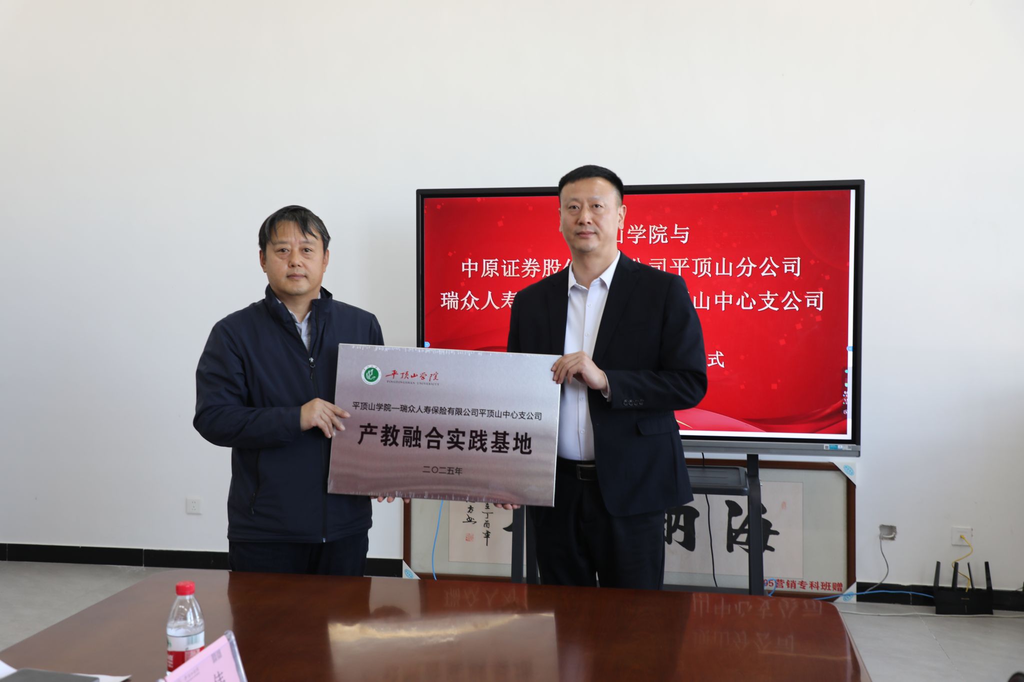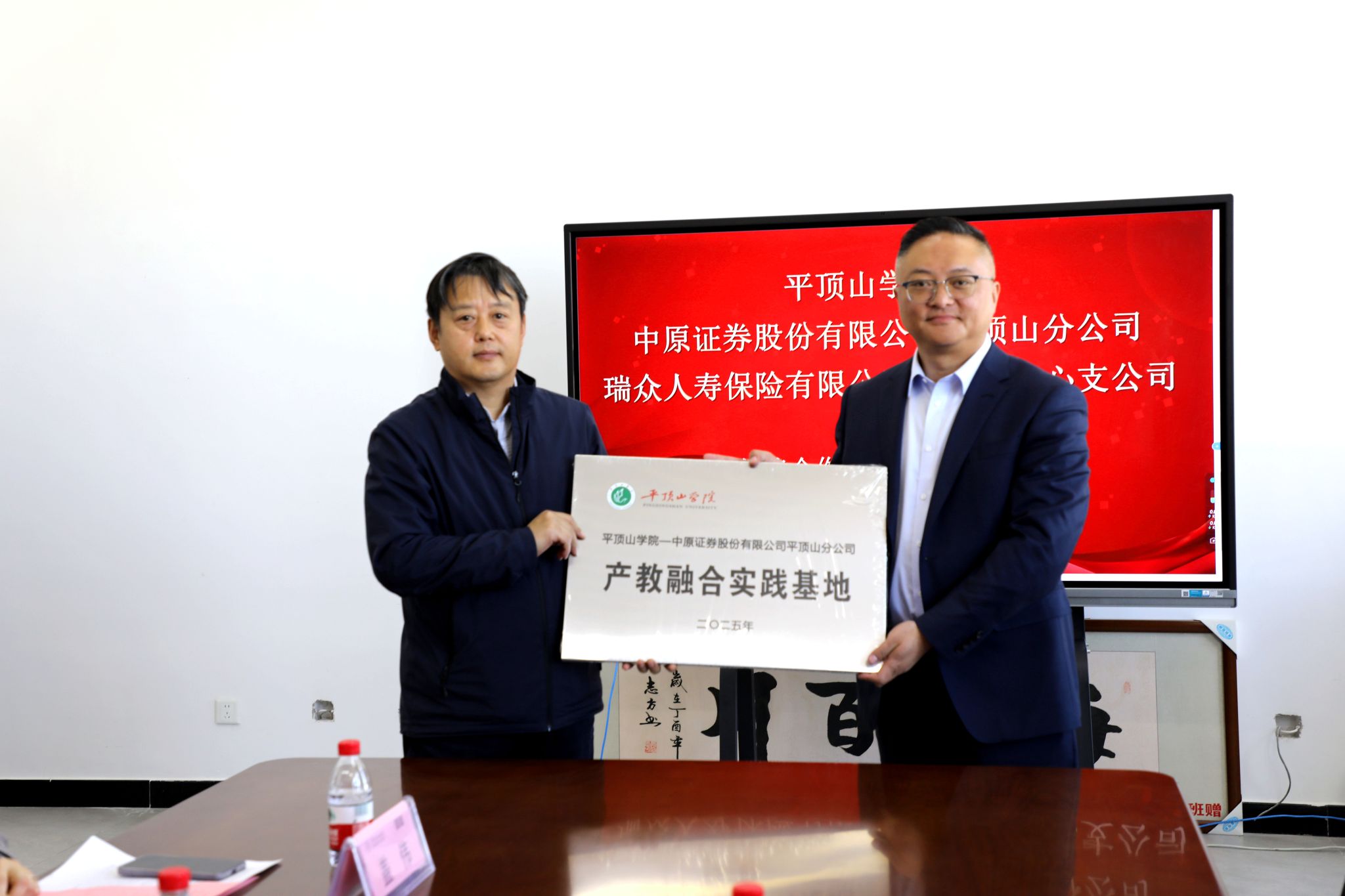 经理张振江分别与中原证券股份有限公司平顶山分公司、瑞众人寿保险有限公司平顶山中心支公司签署了合作协议。随后,李波副董事长为两家合作机构授予“beat365中文官网产教融合实践基地”牌匾,校教务处处长李青彬、公司党委书记刘嘉俊为合作方颁发聘书,标志着双方合作进入实质性阶段。