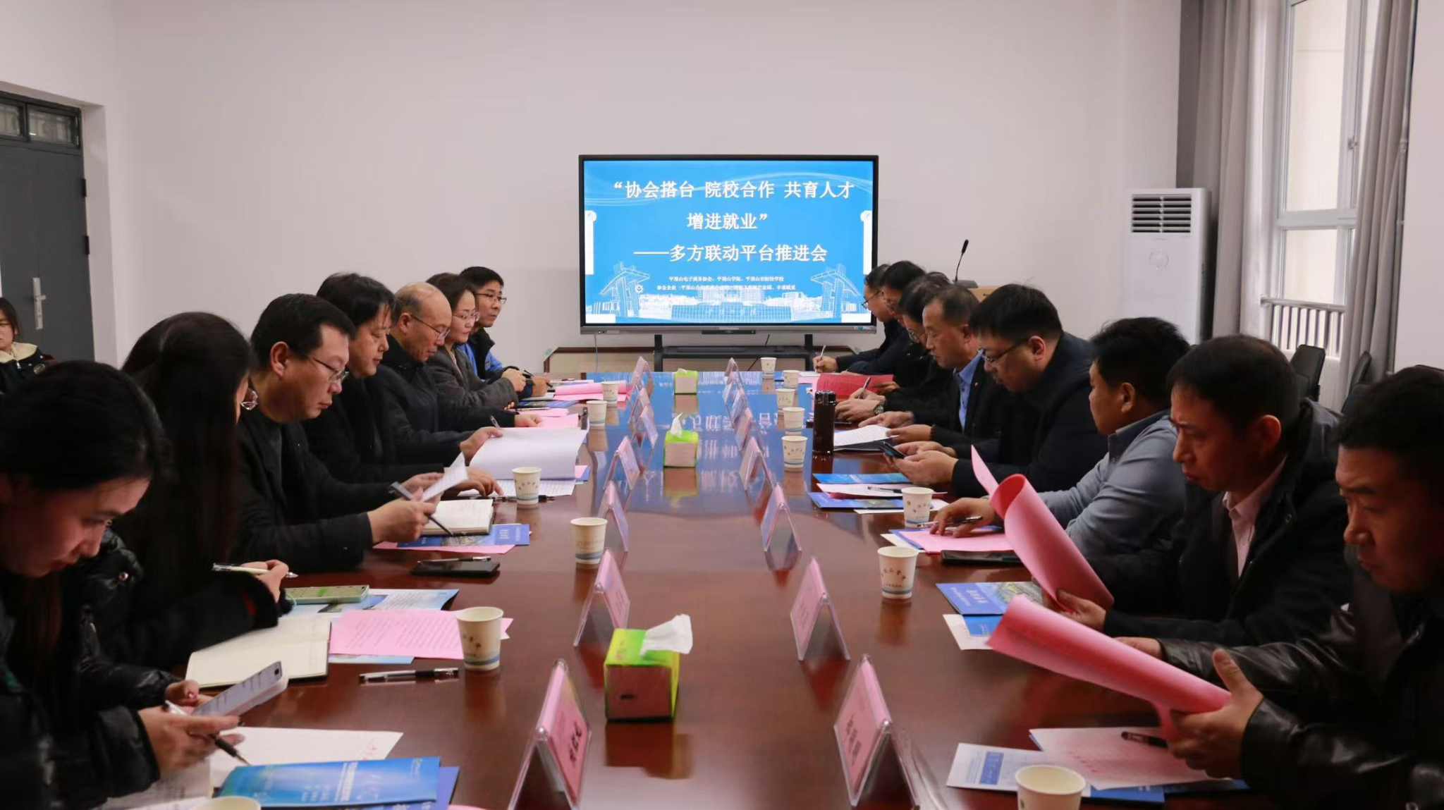 12 月 22 日下午,“协会搭台 院校合作 共育人才 增进就业” 多方联动平台推进会在知行楼 RB422 会议室召开。平顶山市财经公司党委书记周勃、平顶山市电子商务协会秘书长 姬国平、公司副董事长李波及相关部门、公司负责人,企业代表及部分师生代表齐聚,共探“政会校企”协同育人新路径。会议由平顶山市电子商务协会秘书长姬国平主持。