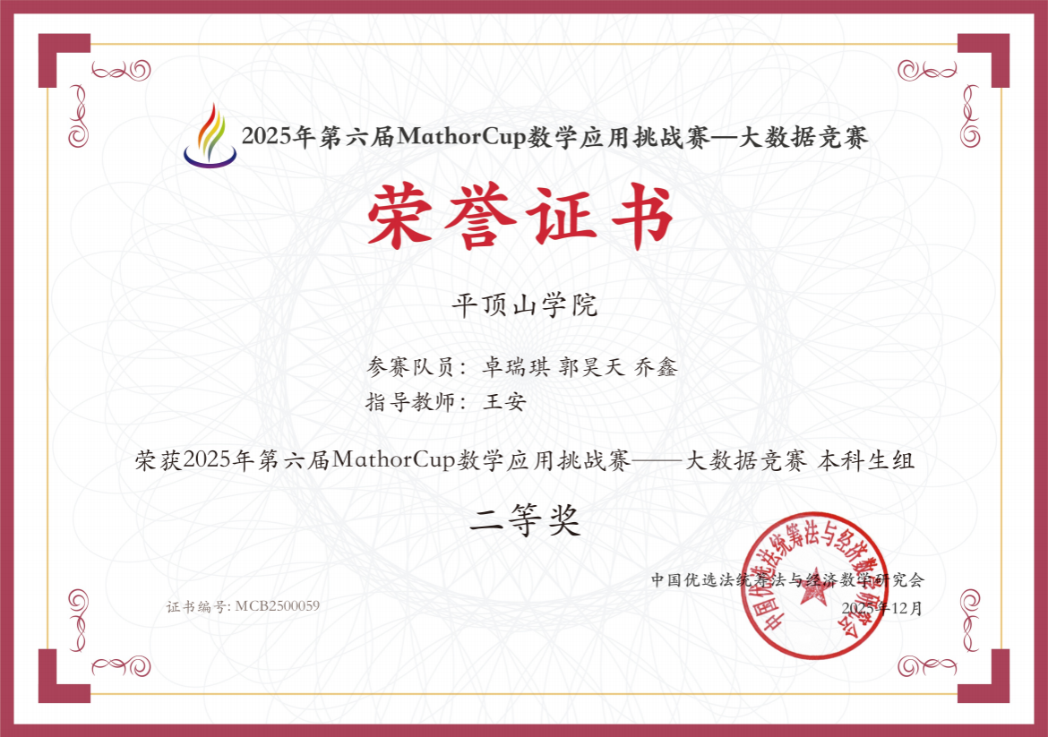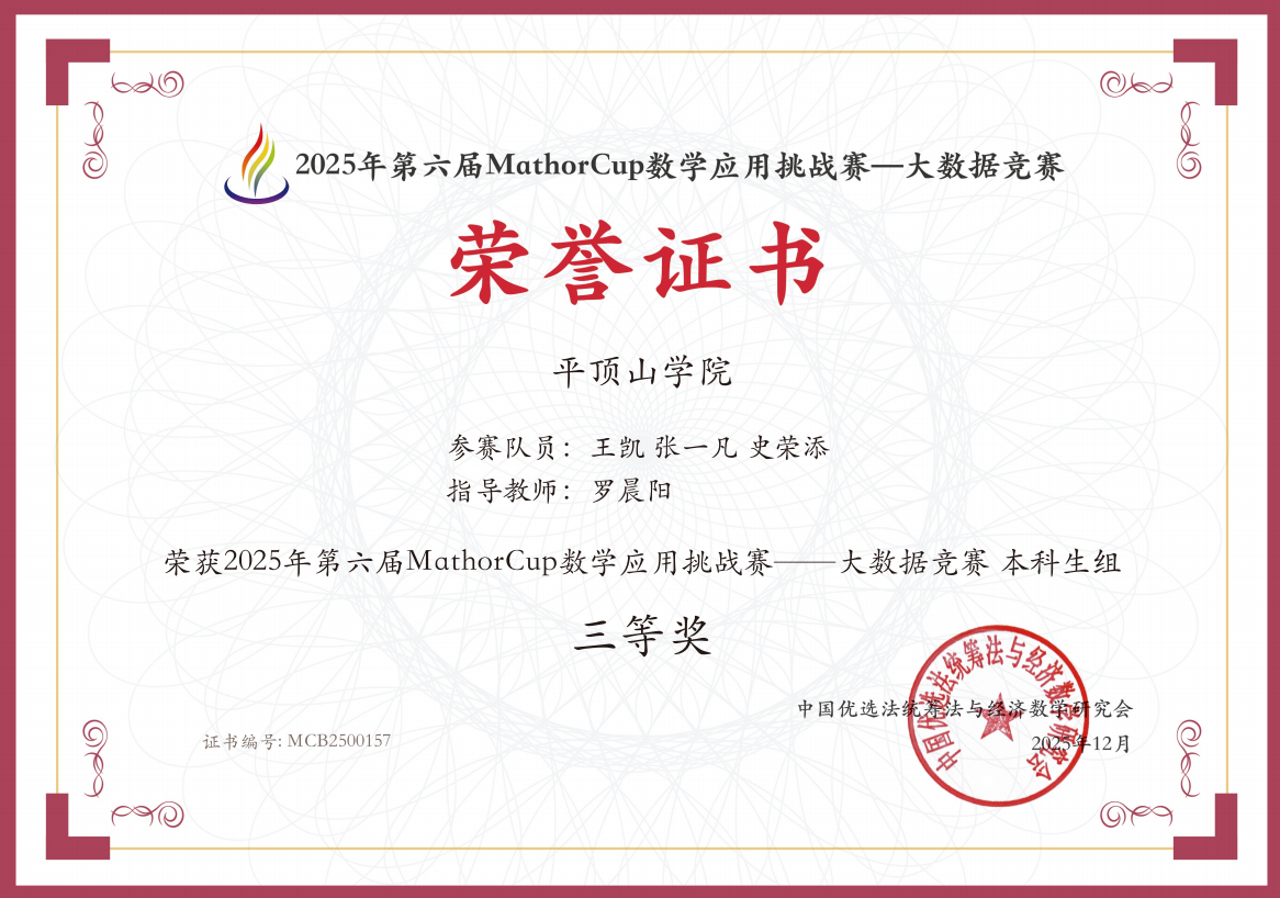 与此同时,在第六届MathorCup数学应用挑战赛-大数据竞赛中,卓瑞琪团队再次发力,荣获国家二等奖,王凯团队荣获国家三等奖。