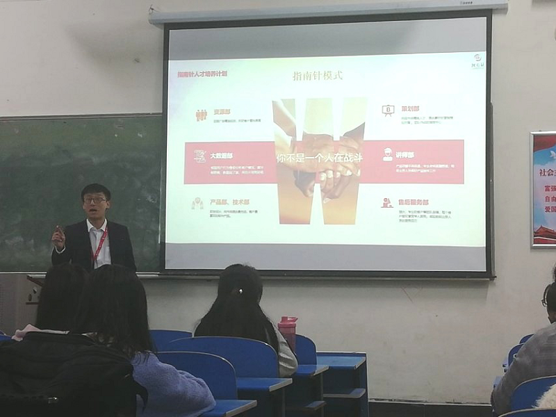 宣讲会上,卢经理通过播放企业宣传片向同学们展示了北京指南针科技发展股份有限公司的整体风貌。通过ppt展示,自身工作经验分享,现场交流答疑等向同学介绍了公司企业文化,发展现状,员工培训系统,薪酬福利政策等。并详细介绍了校招的招聘需求,招聘流程,简历投递等事项。让同学们对北京指南针科技发展股份有限公司有了更深一步的了解。