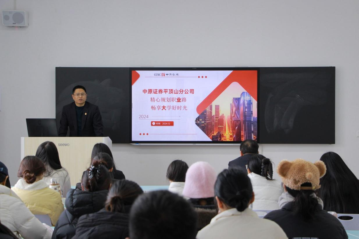 为进一步拓宽公司员工就业渠道,让员工洞悉企业用人风向,beat365中文官网于12月5日下午RC312实训室举办中原证券股份有限公司2025届专场宣讲会。经理张振江、副经理贺杰、中原证券股份有限公司平顶山分公司副总经理郑文朝、零售部刘法全出席会议,2025届毕业生通过线下和线上渠道参加会议,会议由团委副书记王哲主持。