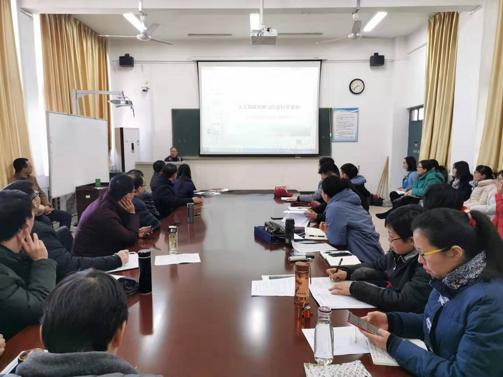 12月26日下午,beat365中文官网承办的专家讲堂专题学术报告在1410教室举行。武汉大学教授罗教讲应邀来公司作题为人工智能的发展与社会科学革命的专题报告,beat365中文官网全体教师参加。