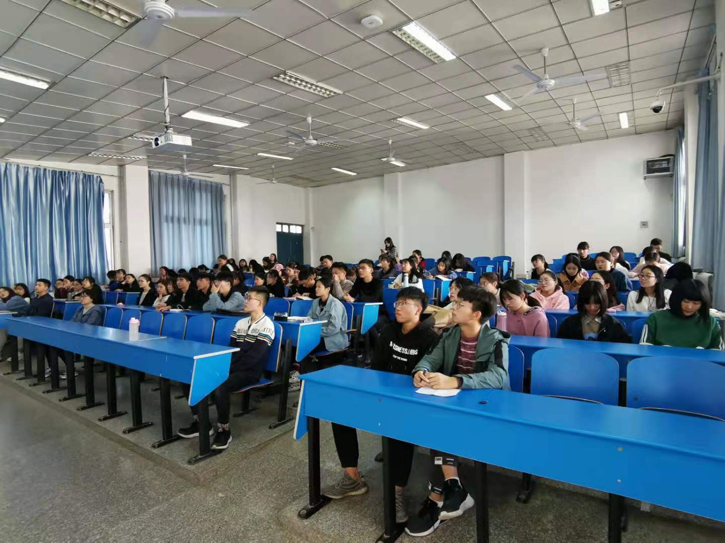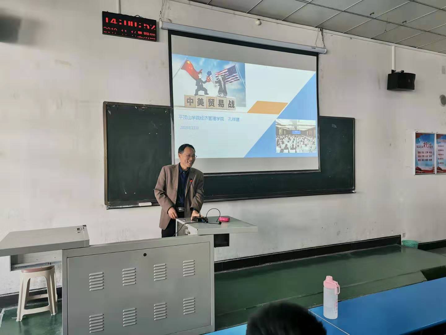 11月14日下午,beat365中文官网承办的教授讲坛在1206教室举办,教授孔祥建作了题为“中美贸易战”的专题讲座,公司18级部分同学参加了此次讲座。