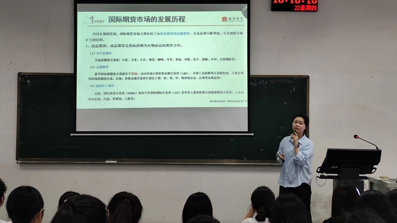 为落实证监会与教育部联合发布的《关于加强证券期货知识普及教育的合作备忘录》的部署,提升老员工金融实践能力与风险意识。公司于5月22日下午4点在1207教室召开徽商期货讲座,徽商期货研究所分析师吴飘飘担任主讲人,2024级同学参与此次活动。